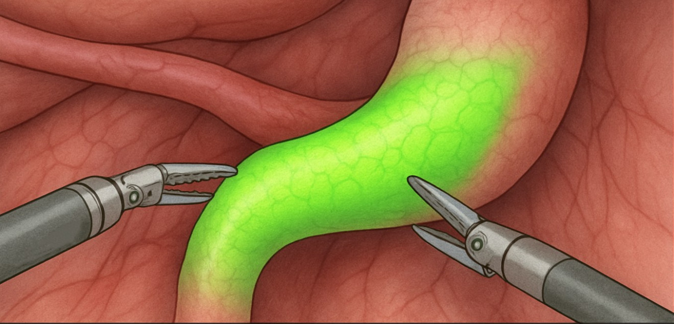 Рис. 3. Применение ICG-флуоресценции для оценки перфузии желудочного трансплантата.